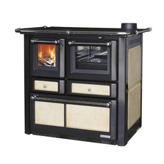 Stilvolles Ambiente für die Küche: Der elegante Festbrennstoffherd mit umlaufender, verchromter Herdstange verspricht freien Blick auf das lodernde Flammenspiel dank seiner großen Sichtscheibe in der Heiztür und besticht mit der eleganten Keramik und durch hochwertige Materialien und präzise